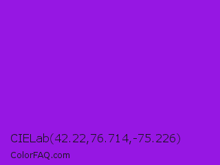 CIELab 42.22,76.714,-75.226 Color is a normal purple color and the nearest color is Veronica #a020f0. Hex code #9617e3 and RGB value is rgb(150,23,227). In RGB color space, this color is composed of 59% red, 9% green, 89% blue, In CMYK color space, this color is composed of 34% cyan, 90% magenta, 0% yellow , 11% black , In HSL color space, this color has a hue angle of 277° , 82% saturation and 49% lightness.