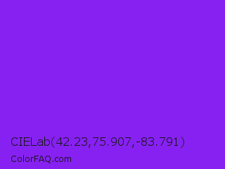 CIELab 42.23,75.907,-83.791 Color is a normal violet color and the nearest color is Blue Violet #8a2be2. Hex code #8721f2 and RGB value is rgb(135,33,242). In RGB color space, this color is composed of 53% red, 13% green, 95% blue, In CMYK color space, this color is composed of 44% cyan, 86% magenta, 0% yellow , 5% black , In HSL color space, this color has a hue angle of 269° , 89% saturation and 54% lightness.