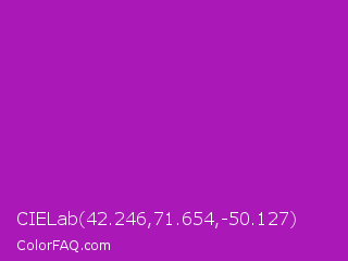 CIELab 42.246,71.654,-50.127 Color is a normal magenta color and the nearest color is Heliotrope Magenta #aa00bb. Hex code #aa18b8 and RGB value is rgb(170,24,184). In RGB color space, this color is composed of 67% red, 9% green, 72% blue, In CMYK color space, this color is composed of 8% cyan, 87% magenta, 0% yellow , 28% black , In HSL color space, this color has a hue angle of 295° , 77% saturation and 41% lightness.