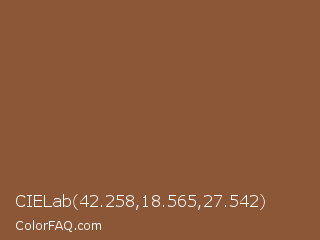CIELab 42.258,18.565,27.542 Color is a normal orange color and the nearest color is Potters Clay #8c5738. Hex code #8c5737 and RGB value is rgb(140,87,55). In RGB color space, this color is composed of 55% red, 34% green, 22% blue, In CMYK color space, this color is composed of 0% cyan, 38% magenta, 61% yellow , 45% black , In HSL color space, this color has a hue angle of 23° , 44% saturation and 38% lightness.
