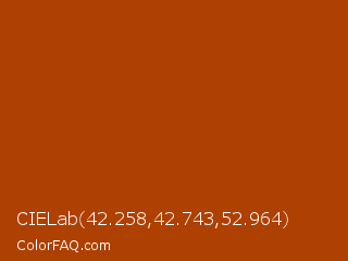 CIELab 42.258,42.743,52.964 Color is a normal orange color and the nearest color is Fire #aa4203. Hex code #ae4001 and RGB value is rgb(174,64,1). In RGB color space, this color is composed of 68% red, 25% green, 0% blue, In CMYK color space, this color is composed of 0% cyan, 63% magenta, 99% yellow , 32% black , In HSL color space, this color has a hue angle of 22° , 99% saturation and 34% lightness.