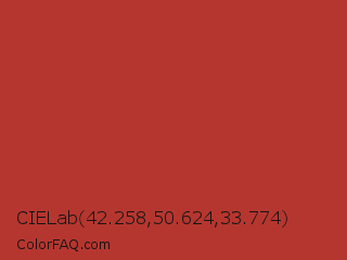 CIELab 42.258,50.624,33.774 Color is a normal red color and the nearest color is Well Read #b43332. Hex code #b5362f and RGB value is rgb(181,54,47). In RGB color space, this color is composed of 71% red, 21% green, 18% blue, In CMYK color space, this color is composed of 0% cyan, 70% magenta, 74% yellow , 29% black , In HSL color space, this color has a hue angle of 3° , 59% saturation and 45% lightness.