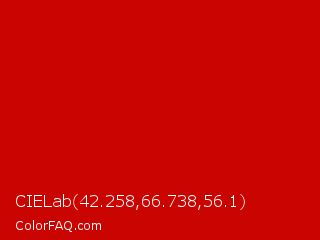 CIELab 42.258,66.738,56.1 Color is a normal red color and the nearest color is Boston University Red #cc0000. Hex code #ca0501 and RGB value is rgb(202,5,1). In RGB color space, this color is composed of 79% red, 2% green, 0% blue, In CMYK color space, this color is composed of 0% cyan, 98% magenta, 100% yellow , 21% black , In HSL color space, this color has a hue angle of 1° , 99% saturation and 40% lightness.