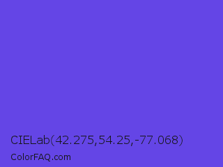 CIELab 42.275,54.25,-77.068 Color is a normal indigo color and the nearest color is Majorelle Blue #6050dc. Hex code #6445e6 and RGB value is rgb(100,69,230). In RGB color space, this color is composed of 39% red, 27% green, 90% blue, In CMYK color space, this color is composed of 57% cyan, 70% magenta, 0% yellow , 10% black , In HSL color space, this color has a hue angle of 252° , 76% saturation and 59% lightness.