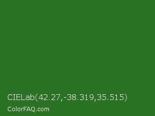 CIELab 42.27,-38.319,35.515 Color is a dark green color and the nearest color is Bilbao #327c14. Hex code #2b7224 and RGB value is rgb(43,114,36). In RGB color space, this color is composed of 17% red, 45% green, 14% blue, In CMYK color space, this color is composed of 62% cyan, 0% magenta, 68% yellow , 55% black , In HSL color space, this color has a hue angle of 115° , 52% saturation and 29% lightness.