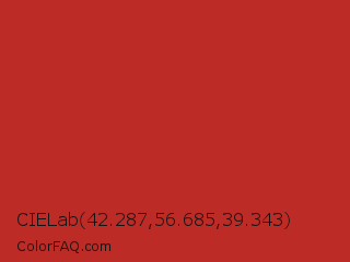 CIELab 42.287,56.685,39.343 Color is a normal red color and the nearest color is Tall Poppy #b32d29. Hex code #bd2b26 and RGB value is rgb(189,43,38). In RGB color space, this color is composed of 74% red, 17% green, 15% blue, In CMYK color space, this color is composed of 0% cyan, 77% magenta, 80% yellow , 26% black , In HSL color space, this color has a hue angle of 2° , 67% saturation and 45% lightness.