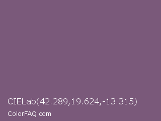 CIELab 42.289,19.624,-13.315 Color is a normal magenta color and the nearest color is Old Lavender #796878. Hex code #7a597a and RGB value is rgb(122,89,122). In RGB color space, this color is composed of 48% red, 35% green, 48% blue, In CMYK color space, this color is composed of 0% cyan, 27% magenta, 0% yellow , 52% black , In HSL color space, this color has a hue angle of 300° , 16% saturation and 41% lightness.