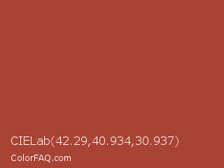 CIELab 42.29,40.934,30.937 Color is a normal red color and the nearest color is Medium Carmine #af4035. Hex code #a94333 and RGB value is rgb(169,67,51). In RGB color space, this color is composed of 66% red, 26% green, 20% blue, In CMYK color space, this color is composed of 0% cyan, 60% magenta, 70% yellow , 34% black , In HSL color space, this color has a hue angle of 8° , 54% saturation and 43% lightness.