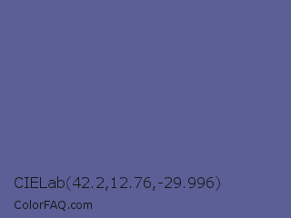CIELab 42.2,12.76,-29.996 Color is a normal blue color and the nearest color is UCLA Blue #536895. Hex code #5c5f95 and RGB value is rgb(92,95,149). In RGB color space, this color is composed of 36% red, 37% green, 58% blue, In CMYK color space, this color is composed of 38% cyan, 36% magenta, 0% yellow , 42% black , In HSL color space, this color has a hue angle of 237° , 24% saturation and 47% lightness.