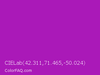 CIELab 42.311,71.465,-50.024 Color is a normal magenta color and the nearest color is Heliotrope Magenta #aa00bb. Hex code #aa19b8 and RGB value is rgb(170,25,184). In RGB color space, this color is composed of 67% red, 10% green, 72% blue, In CMYK color space, this color is composed of 8% cyan, 86% magenta, 0% yellow , 28% black , In HSL color space, this color has a hue angle of 295° , 76% saturation and 41% lightness.