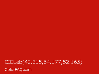 CIELab 42.315,64.177,52.165 Color is a normal red color and the nearest color is International Orange Engineering #ba160c. Hex code #c7150c and RGB value is rgb(199,21,12). In RGB color space, this color is composed of 78% red, 8% green, 5% blue, In CMYK color space, this color is composed of 0% cyan, 89% magenta, 94% yellow , 22% black , In HSL color space, this color has a hue angle of 3° , 89% saturation and 41% lightness.