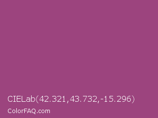 CIELab 42.321,43.732,-15.296 Color is a normal magenta color and the nearest color is Magenta Haze #9f4576. Hex code #9c447e and RGB value is rgb(156,68,126). In RGB color space, this color is composed of 61% red, 27% green, 49% blue, In CMYK color space, this color is composed of 0% cyan, 56% magenta, 19% yellow , 39% black , In HSL color space, this color has a hue angle of 320° , 39% saturation and 44% lightness.