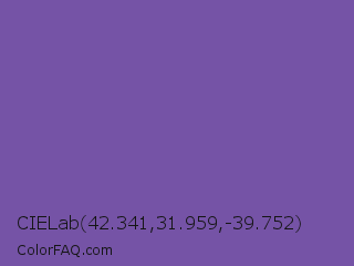 CIELab 42.341,31.959,-39.752 Color is a normal violet color and the nearest color is Royal Purple #7851a9. Hex code #7553a6 and RGB value is rgb(117,83,166). In RGB color space, this color is composed of 46% red, 33% green, 65% blue, In CMYK color space, this color is composed of 30% cyan, 50% magenta, 0% yellow , 35% black , In HSL color space, this color has a hue angle of 265° , 33% saturation and 49% lightness.