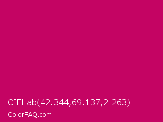 CIELab 42.344,69.137,2.263 Color is a normal rose color and the nearest color is Rubine Red #d10056. Hex code #c40463 and RGB value is rgb(196,4,99). In RGB color space, this color is composed of 77% red, 2% green, 39% blue, In CMYK color space, this color is composed of 0% cyan, 98% magenta, 49% yellow , 23% black , In HSL color space, this color has a hue angle of 330° , 96% saturation and 39% lightness.