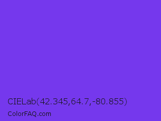 CIELab 42.345,64.7,-80.855 Color is a normal indigo color and the nearest color is Blue Violet #8a2be2. Hex code #7538ed and RGB value is rgb(117,56,237). In RGB color space, this color is composed of 46% red, 22% green, 93% blue, In CMYK color space, this color is composed of 51% cyan, 76% magenta, 0% yellow , 7% black , In HSL color space, this color has a hue angle of 260° , 83% saturation and 57% lightness.