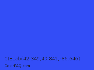 CIELab 42.349,49.841,-86.646 Color is a normal blue color and the nearest color is Ultramarine Blue #4166f5. Hex code #334df7 and RGB value is rgb(51,77,247). In RGB color space, this color is composed of 20% red, 30% green, 97% blue, In CMYK color space, this color is composed of 79% cyan, 69% magenta, 0% yellow , 3% black , In HSL color space, this color has a hue angle of 232° , 92% saturation and 58% lightness.