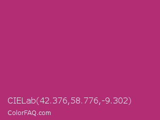CIELab 42.376,58.776,-9.302 Color is a normal rose color and the nearest color is Hibiscus #b6316c. Hex code #b32d75 and RGB value is rgb(179,45,117). In RGB color space, this color is composed of 70% red, 18% green, 46% blue, In CMYK color space, this color is composed of 0% cyan, 75% magenta, 35% yellow , 30% black , In HSL color space, this color has a hue angle of 328° , 60% saturation and 44% lightness.