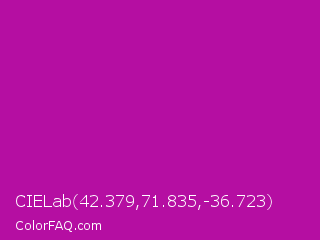 CIELab 42.379,71.835,-36.723 Color is a normal magenta color and the nearest color is Violet Eggplant #991199. Hex code #b50ea2 and RGB value is rgb(181,14,162). In RGB color space, this color is composed of 71% red, 5% green, 64% blue, In CMYK color space, this color is composed of 0% cyan, 92% magenta, 10% yellow , 29% black , In HSL color space, this color has a hue angle of 307° , 86% saturation and 38% lightness.