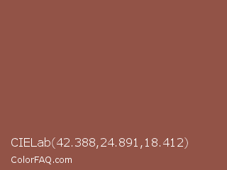 CIELab 42.388,24.891,18.412 Color is a normal red color and the nearest color is Spicy Mix #885342. Hex code #925347 and RGB value is rgb(146,83,71). In RGB color space, this color is composed of 57% red, 33% green, 28% blue, In CMYK color space, this color is composed of 0% cyan, 43% magenta, 51% yellow , 43% black , In HSL color space, this color has a hue angle of 10° , 35% saturation and 43% lightness.
