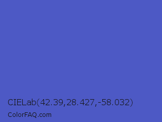 CIELab 42.39,28.427,-58.032 Color is a normal blue color and the nearest color is Indigo #4f69c6. Hex code #4d59c5 and RGB value is rgb(77,89,197). In RGB color space, this color is composed of 30% red, 35% green, 77% blue, In CMYK color space, this color is composed of 61% cyan, 55% magenta, 0% yellow , 23% black , In HSL color space, this color has a hue angle of 234° , 51% saturation and 54% lightness.