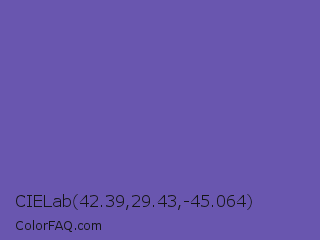CIELab 42.39,29.43,-45.064 Color is a normal indigo color and the nearest color is Blue Violet #6456b7. Hex code #6956af and RGB value is rgb(105,86,175). In RGB color space, this color is composed of 41% red, 34% green, 69% blue, In CMYK color space, this color is composed of 40% cyan, 51% magenta, 0% yellow , 31% black , In HSL color space, this color has a hue angle of 253° , 36% saturation and 51% lightness.