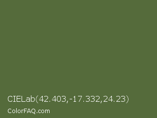 CIELab 42.403,-17.332,24.23 Color is a normal green color and the nearest color is Chalet Green #516e3d. Hex code #556b3b and RGB value is rgb(85,107,59). In RGB color space, this color is composed of 33% red, 42% green, 23% blue, In CMYK color space, this color is composed of 21% cyan, 0% magenta, 45% yellow , 58% black , In HSL color space, this color has a hue angle of 88° , 29% saturation and 33% lightness.