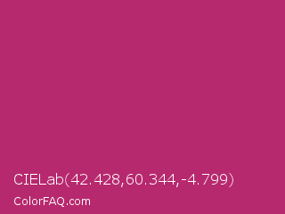 CIELab 42.428,60.344,-4.799 Color is a normal rose color and the nearest color is Hibiscus #b6316c. Hex code #b7296e and RGB value is rgb(183,41,110). In RGB color space, this color is composed of 72% red, 16% green, 43% blue, In CMYK color space, this color is composed of 0% cyan, 78% magenta, 40% yellow , 28% black , In HSL color space, this color has a hue angle of 331° , 63% saturation and 44% lightness.