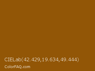 CIELab 42.429,19.634,49.444 Color is a dark orange color and the nearest color is Rusty Nail #86560a. Hex code #925606 and RGB value is rgb(146,86,6). In RGB color space, this color is composed of 57% red, 34% green, 2% blue, In CMYK color space, this color is composed of 0% cyan, 41% magenta, 96% yellow , 43% black , In HSL color space, this color has a hue angle of 34° , 92% saturation and 30% lightness.