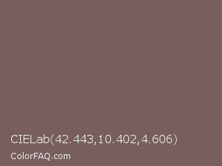 CIELab 42.443,10.402,4.606 Color is a normal red color and the nearest color is Deep Taupe #7e5e60. Hex code #785e5d and RGB value is rgb(120,94,93). In RGB color space, this color is composed of 47% red, 37% green, 36% blue, In CMYK color space, this color is composed of 0% cyan, 22% magenta, 23% yellow , 53% black , In HSL color space, this color has a hue angle of 2° , 13% saturation and 42% lightness.