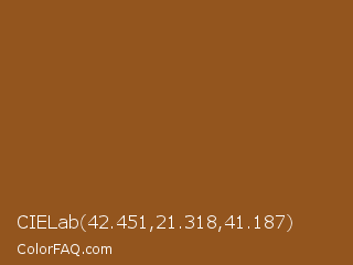 CIELab 42.451,21.318,41.187 Color is a normal orange color and the nearest color is Rope #8e4d1e. Hex code #93551e and RGB value is rgb(147,85,30). In RGB color space, this color is composed of 58% red, 33% green, 12% blue, In CMYK color space, this color is composed of 0% cyan, 42% magenta, 80% yellow , 42% black , In HSL color space, this color has a hue angle of 28° , 66% saturation and 35% lightness.