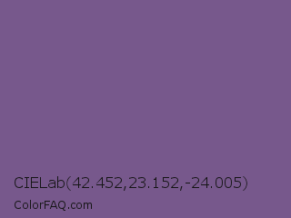 CIELab 42.452,23.152,-24.005 Color is a normal purple color and the nearest color is Dark Lavender #734f96. Hex code #77588c and RGB value is rgb(119,88,140). In RGB color space, this color is composed of 47% red, 35% green, 55% blue, In CMYK color space, this color is composed of 15% cyan, 37% magenta, 0% yellow , 45% black , In HSL color space, this color has a hue angle of 276° , 23% saturation and 45% lightness.