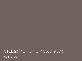 CIELab 42.464,5.465,3.917 Color is a normal red color and the nearest color is Scorpion #695f62. Hex code #70615e and RGB value is rgb(112,97,94). In RGB color space, this color is composed of 44% red, 38% green, 37% blue, In CMYK color space, this color is composed of 0% cyan, 13% magenta, 16% yellow , 56% black , In HSL color space, this color has a hue angle of 10° , 9% saturation and 40% lightness.