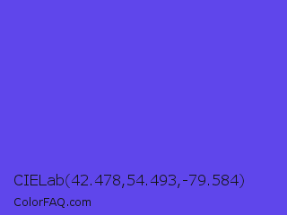 CIELab 42.478,54.493,-79.584 Color is a normal indigo color and the nearest color is Majorelle Blue #6050dc. Hex code #5f46eb and RGB value is rgb(95,70,235). In RGB color space, this color is composed of 37% red, 27% green, 92% blue, In CMYK color space, this color is composed of 60% cyan, 70% magenta, 0% yellow , 8% black , In HSL color space, this color has a hue angle of 249° , 80% saturation and 60% lightness.