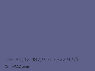 CIELab 42.487,9.303,-22.927 Color is a normal blue color and the nearest color is Dark Blue Gray #666699. Hex code #5f618a and RGB value is rgb(95,97,138). In RGB color space, this color is composed of 37% red, 38% green, 54% blue, In CMYK color space, this color is composed of 31% cyan, 30% magenta, 0% yellow , 46% black , In HSL color space, this color has a hue angle of 237° , 18% saturation and 46% lightness.
