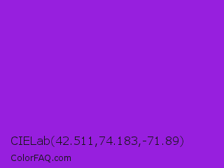 CIELab 42.511,74.183,-71.89 Color is a normal purple color and the nearest color is Blue Violet #8a2be2. Hex code #971fde and RGB value is rgb(151,31,222). In RGB color space, this color is composed of 59% red, 12% green, 87% blue, In CMYK color space, this color is composed of 32% cyan, 86% magenta, 0% yellow , 13% black , In HSL color space, this color has a hue angle of 278° , 75% saturation and 50% lightness.