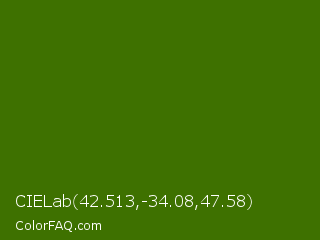 CIELab 42.513,-34.08,47.58 Color is a very dark green color and the nearest color is Green Leaf #436a0d. Hex code #3e7100 and RGB value is rgb(62,113,0). In RGB color space, this color is composed of 24% red, 44% green, 0% blue, In CMYK color space, this color is composed of 45% cyan, 0% magenta, 100% yellow , 56% black , In HSL color space, this color has a hue angle of 87° , 100% saturation and 22% lightness.