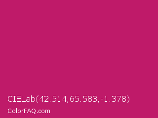 CIELab 42.514,65.583,-1.378 Color is a normal rose color and the nearest color is Rose Red #c21e56. Hex code #bf1a69 and RGB value is rgb(191,26,105). In RGB color space, this color is composed of 75% red, 10% green, 41% blue, In CMYK color space, this color is composed of 0% cyan, 86% magenta, 45% yellow , 25% black , In HSL color space, this color has a hue angle of 331° , 76% saturation and 43% lightness.