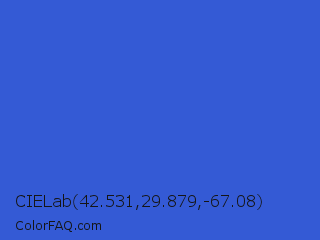 CIELab 42.531,29.879,-67.08 Color is a normal blue color and the nearest color is Mariner #286acd. Hex code #345ad5 and RGB value is rgb(52,90,213). In RGB color space, this color is composed of 20% red, 35% green, 84% blue, In CMYK color space, this color is composed of 76% cyan, 58% magenta, 0% yellow , 16% black , In HSL color space, this color has a hue angle of 226° , 66% saturation and 52% lightness.