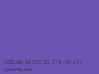 CIELab 42.531,32.774,-47.17 Color is a normal indigo color and the nearest color is Blue Violet #6456b7. Hex code #6d54b3 and RGB value is rgb(109,84,179). In RGB color space, this color is composed of 43% red, 33% green, 70% blue, In CMYK color space, this color is composed of 39% cyan, 53% magenta, 0% yellow , 30% black , In HSL color space, this color has a hue angle of 256° , 38% saturation and 52% lightness.