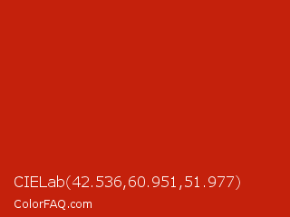 CIELab 42.536,60.951,51.977 Color is a normal red color and the nearest color is International Orange Engineering #ba160c. Hex code #c4210c and RGB value is rgb(196,33,12). In RGB color space, this color is composed of 77% red, 13% green, 5% blue, In CMYK color space, this color is composed of 0% cyan, 83% magenta, 94% yellow , 23% black , In HSL color space, this color has a hue angle of 7° , 88% saturation and 41% lightness.