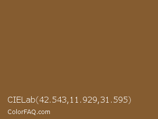 CIELab 42.543,11.929,31.595 Color is a normal orange color and the nearest color is Potters Clay #8c5738. Hex code #855c30 and RGB value is rgb(133,92,48). In RGB color space, this color is composed of 52% red, 36% green, 19% blue, In CMYK color space, this color is composed of 0% cyan, 31% magenta, 64% yellow , 48% black , In HSL color space, this color has a hue angle of 31° , 47% saturation and 35% lightness.