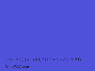 CIELab 42.543,40.584,-70.429 Color is a normal blue color and the nearest color is Iris #5a4fcf. Hex code #5052db and RGB value is rgb(80,82,219). In RGB color space, this color is composed of 31% red, 32% green, 86% blue, In CMYK color space, this color is composed of 63% cyan, 63% magenta, 0% yellow , 14% black , In HSL color space, this color has a hue angle of 239° , 66% saturation and 59% lightness.