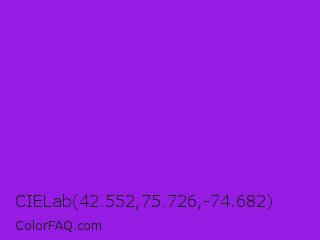 CIELab 42.552,75.726,-74.682 Color is a normal purple color and the nearest color is Veronica #a020f0. Hex code #961ce3 and RGB value is rgb(150,28,227). In RGB color space, this color is composed of 59% red, 11% green, 89% blue, In CMYK color space, this color is composed of 34% cyan, 88% magenta, 0% yellow , 11% black , In HSL color space, this color has a hue angle of 277° , 78% saturation and 50% lightness.