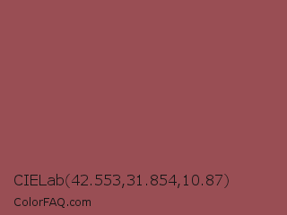 CIELab 42.553,31.854,10.87 Color is a normal red color and the nearest color is Middle Red Purple #a55353. Hex code #994e54 and RGB value is rgb(153,78,84). In RGB color space, this color is composed of 60% red, 31% green, 33% blue, In CMYK color space, this color is composed of 0% cyan, 49% magenta, 45% yellow , 40% black , In HSL color space, this color has a hue angle of 355° , 32% saturation and 45% lightness.