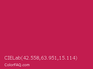 CIELab 42.558,63.951,15.114 Color is a normal rose color and the nearest color is Rose Red #c21e56. Hex code #c21c4f and RGB value is rgb(194,28,79). In RGB color space, this color is composed of 76% red, 11% green, 31% blue, In CMYK color space, this color is composed of 0% cyan, 86% magenta, 59% yellow , 24% black , In HSL color space, this color has a hue angle of 342° , 75% saturation and 44% lightness.