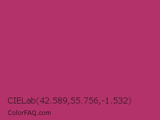 CIELab 42.589,55.756,-1.532 Color is a normal rose color and the nearest color is Hibiscus #b6316c. Hex code #b33269 and RGB value is rgb(179,50,105). In RGB color space, this color is composed of 70% red, 20% green, 41% blue, In CMYK color space, this color is composed of 0% cyan, 72% magenta, 41% yellow , 30% black , In HSL color space, this color has a hue angle of 334° , 56% saturation and 45% lightness.