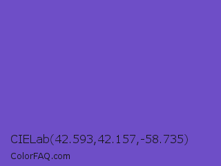 CIELab 42.593,42.157,-58.735 Color is a normal indigo color and the nearest color is Slate Blue #6a5acd. Hex code #6e4ec7 and RGB value is rgb(110,78,199). In RGB color space, this color is composed of 43% red, 31% green, 78% blue, In CMYK color space, this color is composed of 45% cyan, 61% magenta, 0% yellow , 22% black , In HSL color space, this color has a hue angle of 256° , 52% saturation and 54% lightness.