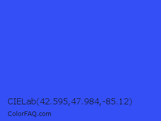 CIELab 42.595,47.984,-85.12 Color is a normal blue color and the nearest color is Ultramarine Blue #4166f5. Hex code #334ff5 and RGB value is rgb(51,79,245). In RGB color space, this color is composed of 20% red, 31% green, 96% blue, In CMYK color space, this color is composed of 79% cyan, 68% magenta, 0% yellow , 4% black , In HSL color space, this color has a hue angle of 231° , 91% saturation and 58% lightness.