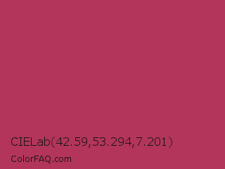 CIELab 42.59,53.294,7.201 Color is a normal rose color and the nearest color is Rich Maroon #b03060. Hex code #b3355b and RGB value is rgb(179,53,91). In RGB color space, this color is composed of 70% red, 21% green, 36% blue, In CMYK color space, this color is composed of 0% cyan, 70% magenta, 49% yellow , 30% black , In HSL color space, this color has a hue angle of 342° , 54% saturation and 45% lightness.