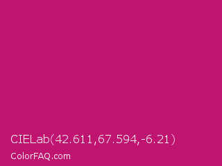 CIELab 42.611,67.594,-6.21 Color is a normal rose color and the nearest color is Magenta Dye #ca1f7b. Hex code #c01471 and RGB value is rgb(192,20,113). In RGB color space, this color is composed of 75% red, 8% green, 44% blue, In CMYK color space, this color is composed of 0% cyan, 90% magenta, 41% yellow , 25% black , In HSL color space, this color has a hue angle of 328° , 81% saturation and 42% lightness.